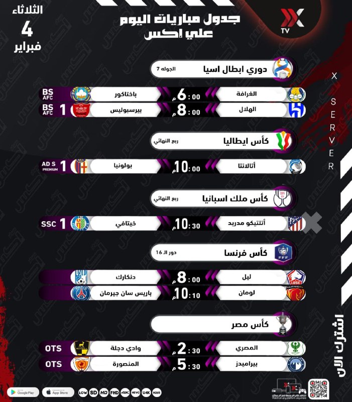 🎉 *سيرفر اكس يقدم لكم جدول اهم المباريات فى الدوريات والبطولات المختلفة .* 🎉
